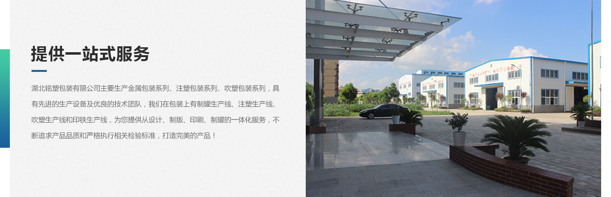 湖北銘塑包裝有限公司一家集研發、生產、銷售于一體的較優秀民營企業,技術力量雄厚,產品質量可靠。位于交通暢順,百業興旺、經濟富裕、政策開放的孝感開發區域。我們企業的營銷戰略是以建筑為土壤,以產品為種子,以質量為肥料,讓綠色鋪滿全球。憑借多年來的行業經驗,公司不斷進行創新和研發,為市場提供更廣泛的產品應用領域和更好環保節能產品,為國家能源環保戰略和可持續發展戰略作出應有的貢獻。 湖北銘塑包裝有限公司主要生產金屬包裝系列、注塑包裝系列、吹塑包裝系列,具有先進的生產設備及優良的技術團隊,我們在包裝上有制罐生產線、注塑生產線、吹塑生產線和印鐵生產線,為您提供從設計、制版、印刷、制罐的一體化服務,不斷追求產品品質和嚴格執行相關檢驗標準,打造更好的產品!